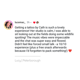 Inspired by the small wonders of nature, each tattoo is created with care and thought in my peaceful garden studio near Bedford - a private space where every appointment is calm, intentional, and just for you.